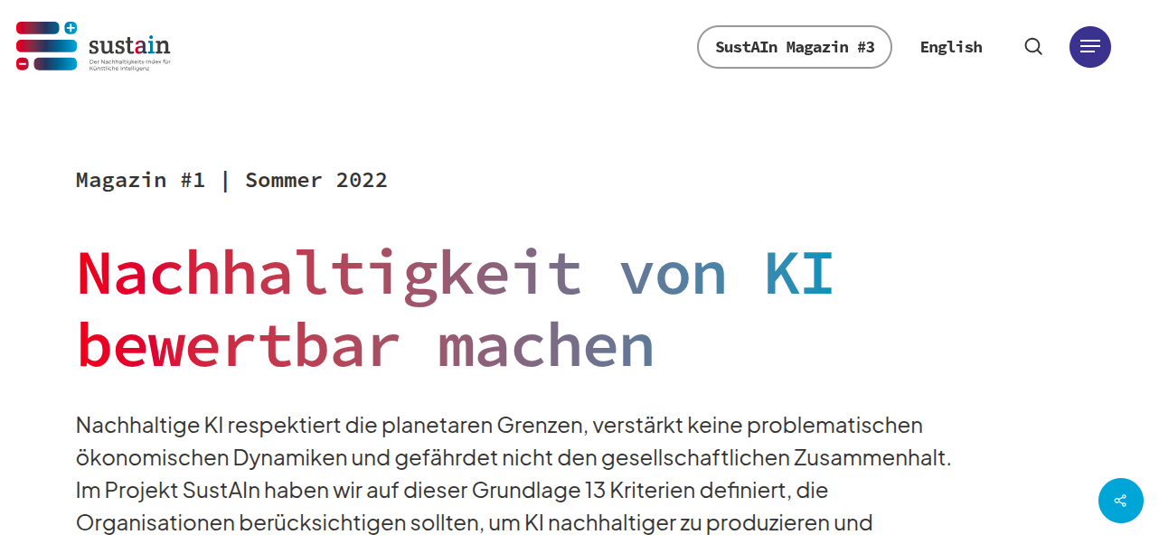 Screenshot der Seite sustain von AlgorithmWatch zu einem vierteiligen Angebot in Form von Magazinen zu KI und Nachhaltigkeit