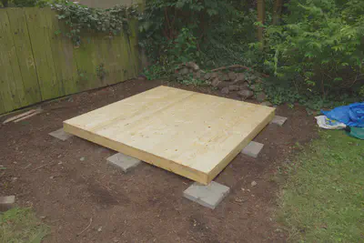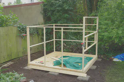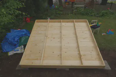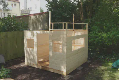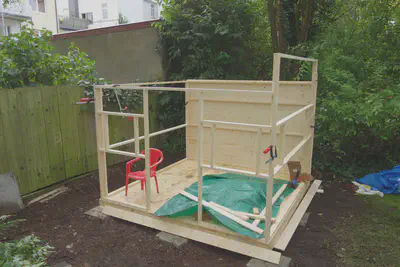 Zunächst habe ich ein stabiles Podest aus Glattkantbrettern gebaut, das an den Ecken und Seiten auf Gehwegplatten aufliegt. Anschließend habe ich mit ungehobelten Dachlatten eine Konstruktion für die Wände gezimmert, an die die Profilbretter geschraubt wurden. Das Podest und die Wände habe ich mit einem Fäulnisschutz gestrichen.