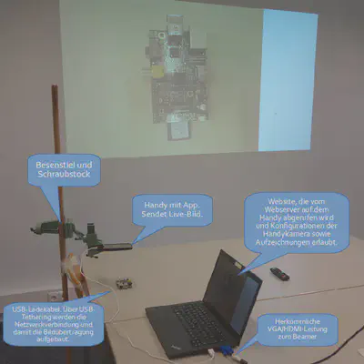Nach dem Erwerb eines neuen Handys (Motorola Moto G, 3rd Gen. mit CyanogenMod 12.1) habe ich diesbezüglich mal wieder den Fdroid-Store und Aptoide nach einer Anwendung durchsucht, die das Kamerabild des Handys in Echtzeit (übers Netz) verfügbar macht. Ich fand schließlich die Wifi Camera (Fdroid) und die App IP Webcam, die genau das kann, was ich gesucht habe - und zwar in einer begeisternden Auflösung und mit erstaunlich wenig Delay im Bildupdate (s. Abb. 2). Es handelt sich bei dem folgenden Aufbau eindeutig um ein digitales Epidiaskop, das bis auf die Besenstiel-Schraubstock-Klebeband-Stuhl-Konstruktion mobil ist. Daher nenne ich es jetzt mal Mopidiaskop.