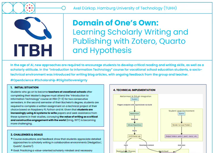 Im Zeitalter der künstlichen Intelligenz sind neue Ansätze erforderlich, um Studierende zu ermutigen, kritische Lese- und Schreibfähigkeiten sowie eine wissenschaftliche Haltung zu entwickeln. Im Kurs “Einführung in die Informationstechnologie” für Berufsschüler*innen an der TU Hamburg habe ich eine soziotechnische Umgebung für das Schreiben von Blogartikeln entwickelt und eingeführt, mit der erste Schreibversuche in der Gruppe erprobt werden können.
