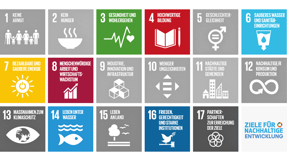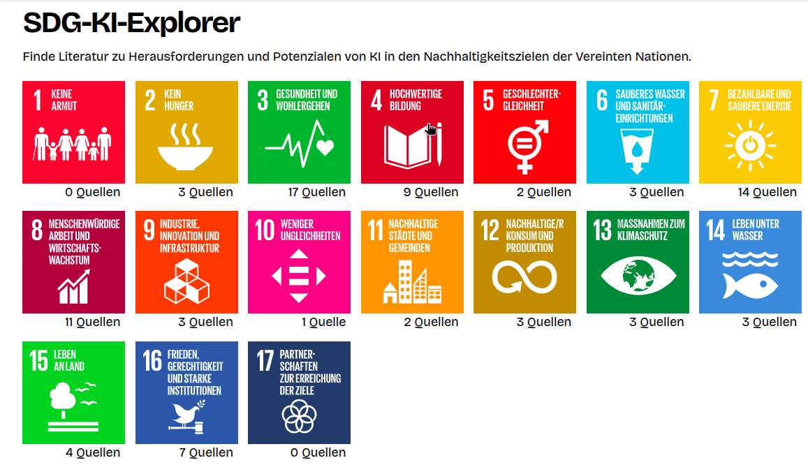 Die 17 Nachhaltigkeitsziele der UN stellen einen möglichen Reflexionsrahmen dar, mit dem sich KI-Systeme in den Bereichen Wirtschaft, Soziales und Umwelt betrachten lassen.