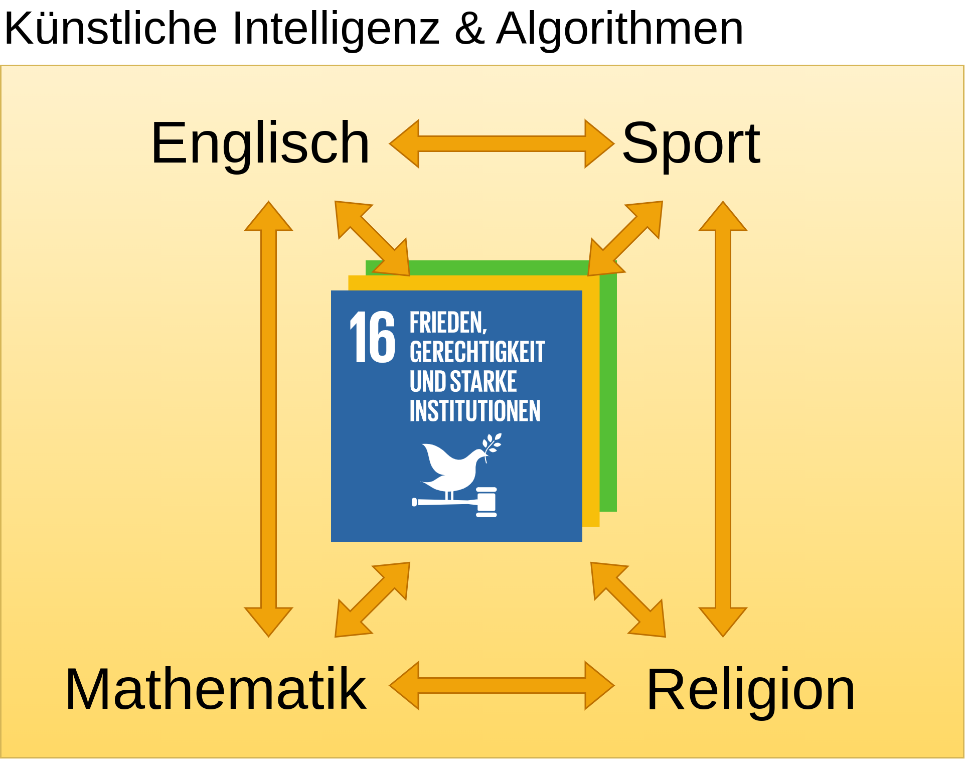 Die folgende Darstellung zeigt, wie sich vier Fächer untereinander und in Bezug auf KI und Nachhaltigkeit mit einem konkreten Problem auseinandersetzen könnten.